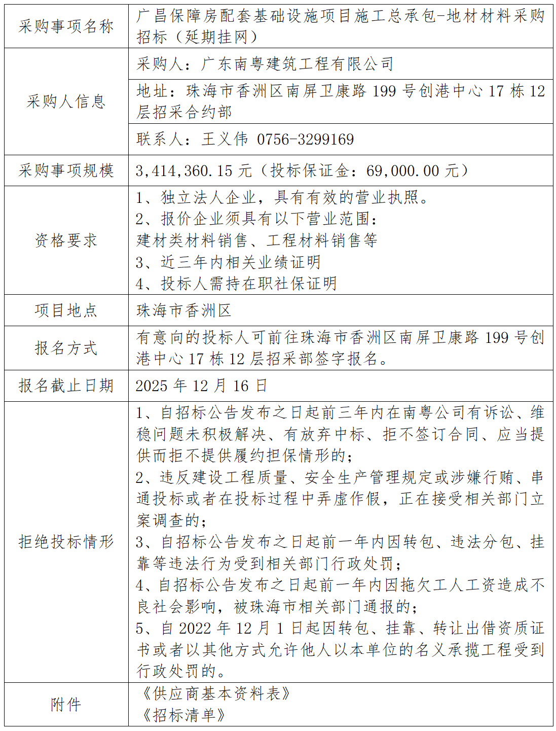 廣昌保障房配套基礎設施項目施工總承包-地材材料采購招標(延期掛網(wǎng)) 專欄:工程招標 發(fā)布日期: 2025-12-11 作者:招采管理中心 附件:供應商基本資料表 附件:廣昌保障房配套基礎設施項目施工總承包-地材材料采購招標清單 返回列表 上一篇:廣昌保障房配套基礎設施項目施工總承包-混凝土材料采購(預算、稅率變更) 下一篇:廣昌保障房配套基礎設施項目施工總承包-鋼管租賃服務