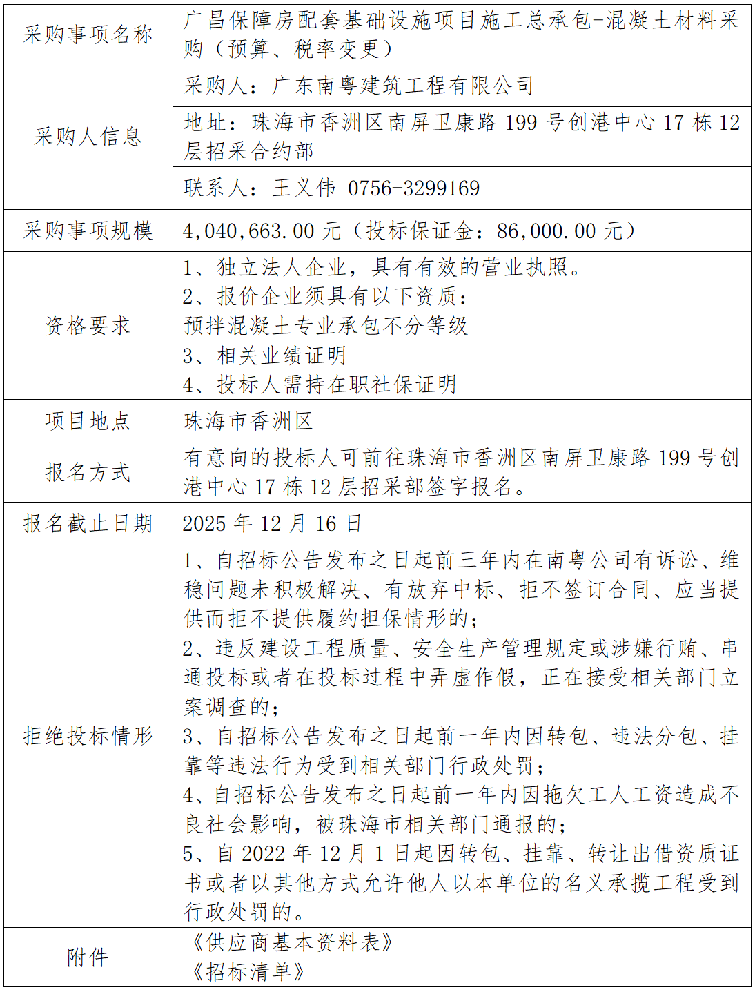 廣昌保障房配套基礎(chǔ)設(shè)施項(xiàng)目施工總承包-混凝土材料采購(預(yù)算、稅率變更) 專欄:工程招標(biāo) 發(fā)布日期: 2025-12-11 作者:招采管理中心 附件:供應(yīng)商基本資料表 附件:廣昌保障房配套基礎(chǔ)設(shè)施項(xiàng)目施工總承包-混凝土材料采購招標(biāo)清單 返回列表 上一篇:仁恒星園-翠前路交翠峰路遷移交通信號(hào)燈項(xiàng)目 下一篇:廣昌保障房配套基礎(chǔ)設(shè)施項(xiàng)目施工總承包-地材材料采購招標(biāo)(延期掛網(wǎng))