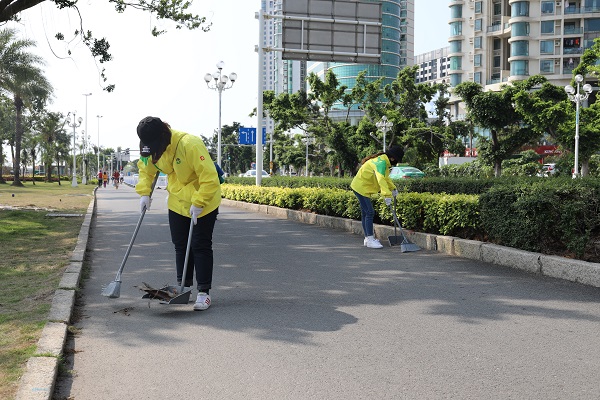 當(dāng)天上午8點(diǎn)40分,各支援人員已在海峽社區(qū)公園小廣場(chǎng)前集合完畢。講清注意事項(xiàng)后,各組人員就在小組長(zhǎng)的帶領(lǐng)下簽領(lǐng)好工具前往自己所負(fù)責(zé)的工作區(qū)域內(nèi)迅速開(kāi)展工作,長(zhǎng)長(zhǎng)的情侶路立馬被“小黃人”們占領(lǐng)。