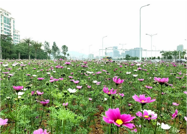 華發(fā)新城藍(lán)天水岸門旁的波斯菊花海