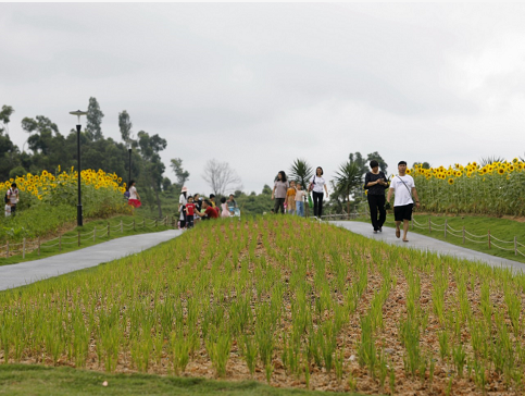 據(jù)介紹,香洲正方在公園環(huán)湖路附近開墾出一片“都市田園”,成為市民游客來公園必到打卡地。截至目前,這片“都市田園”總面積達(dá)1500平方米,包括400平方米的向日葵、600平方米的百日菊,還有番茄、旱稻、南瓜等農(nóng)作物。希望通過“都市田園”的開辟,讓小朋友們能夠近距離地接觸到大自然,了解書本里的農(nóng)作物,逐漸將其打造成園區(qū)的一個城市科普基地。