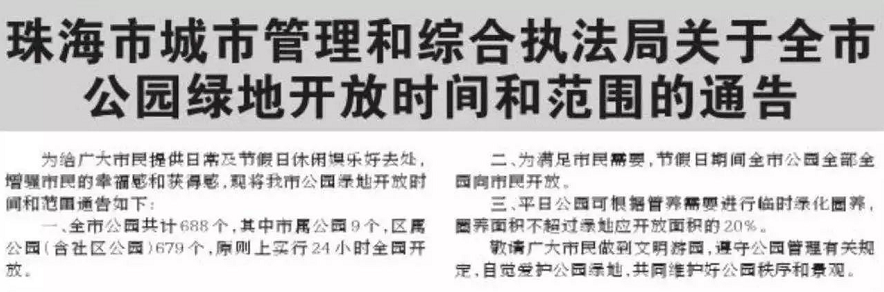 6月20日,珠海市城市管理和綜合執(zhí)法局發(fā)布《關(guān)于全市公園綠地開(kāi)放時(shí)間和范圍的通告》(以下簡(jiǎn)稱《通告》),《通告》強(qiáng)調(diào)珠海全市公園共計(jì)688個(gè)公園原則上都實(shí)行24小時(shí)全園開(kāi)放,節(jié)假日期間全市公園全部全員向市民開(kāi)放。這一項(xiàng)還綠于民的措施,滿足市民休閑鍛煉的需求,有效增強(qiáng)市民的幸福感。