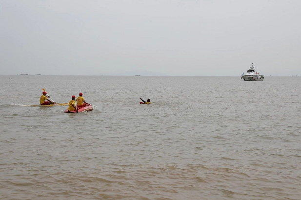 香洲正方主要演練科目為搶救溺水游客。游客溺水場景模擬開始,香洲正方迅速組織救生員展開施救,香洲區(qū)森林消防南灣分隊(duì)的救援人員也劃著橡皮艇加入了救援行動。