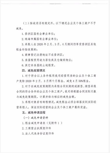 (一)針對(duì)承租我司經(jīng)營(yíng)性用房從事生產(chǎn)、辦公、批發(fā)零售、餐飲、超市、藥店及其他便民服務(wù)的,且在香洲區(qū)注冊(cè),按照政府要求落實(shí)防疫規(guī)定的企業(yè)及個(gè)體工商戶