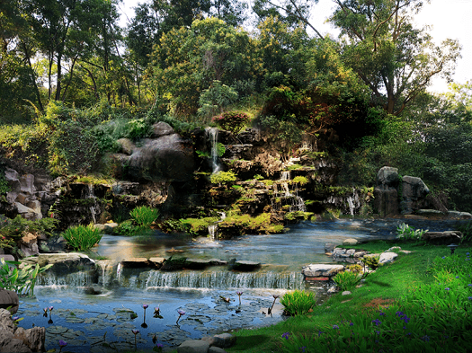 結(jié)合南方夏季多雨的地域特色,還別出心裁設(shè)計“多功能水景”,讓湖島和水道在豐水季節(jié)可供賞水親水,枯水季節(jié)還有巖石景觀可賞,做到靈活,一水多用。