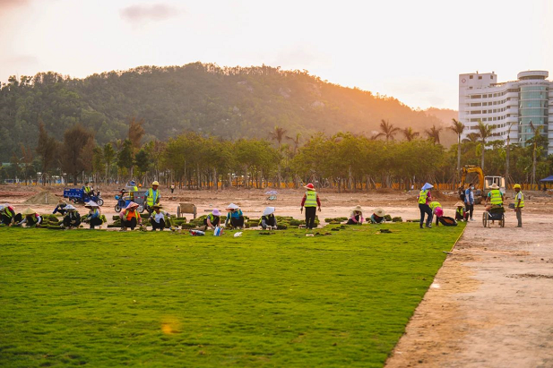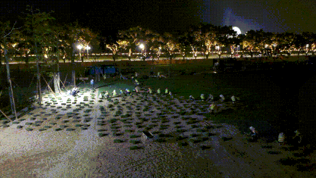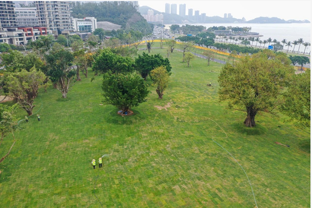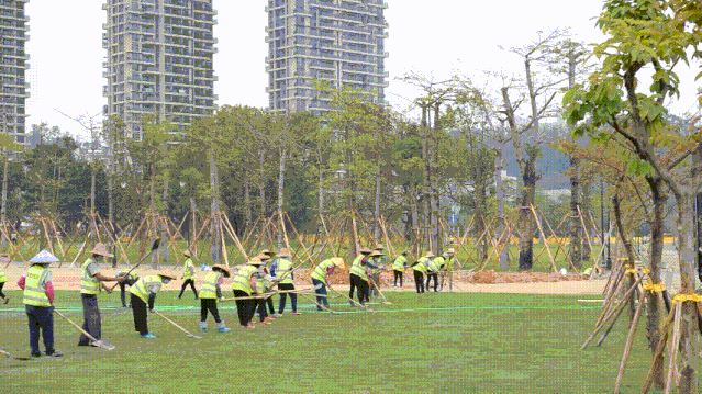 目前,海天公園管養(yǎng)提升項(xiàng)目進(jìn)度已完成75%,各種機(jī)械正在如火如荼運(yùn)轉(zhuǎn),各項(xiàng)工作正在快速有序推進(jìn)。其中,公園東部靠海天驛站一側(cè)已完成臺(tái)灣草草坪鋪設(shè),呈現(xiàn)出碧草茵茵的風(fēng)貌。在中央大草坪的鋪設(shè)現(xiàn)場,只見百余工人正在快速鋪草、壓土,一會(huì)功夫一塊平整無縫的新草坪就呈現(xiàn)在眾人眼前。