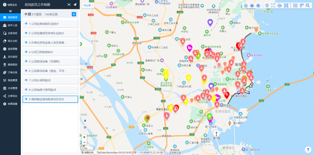 香洲正方利用信息技術(shù)和大數(shù)據(jù)優(yōu)勢,結(jié)合防風(fēng)防汛工作實(shí)際情況,在地圖無憂軟件平臺繪制“防風(fēng)防汛一張地圖”,分別建立了應(yīng)急搶險隊(duì)伍、勞務(wù)單位應(yīng)急隊(duì)伍、三防物資、水浸黒點(diǎn)、地質(zhì)災(zāi)害風(fēng)險點(diǎn)、在建項(xiàng)目工程大型裝備等信息模塊,并將重點(diǎn)應(yīng)急搶險區(qū)域作了明確劃分,進(jìn)一步提升了公司防汛應(yīng)急處置能力。
