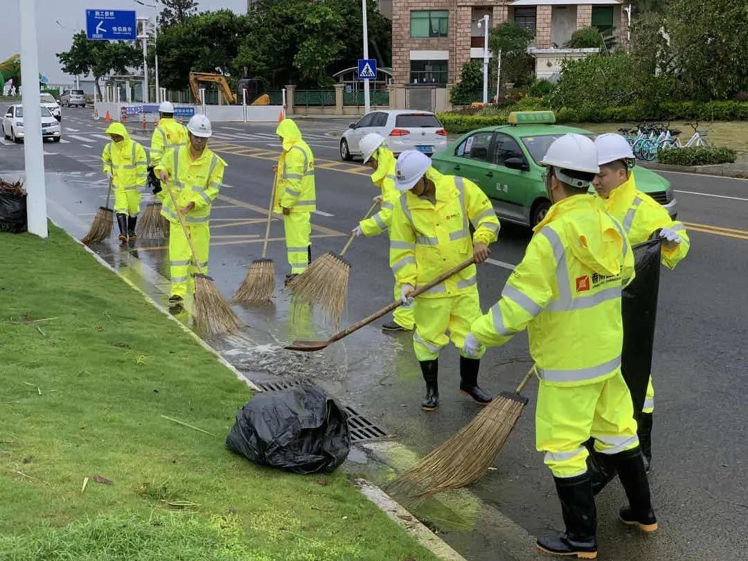 路堵了,橋封了,暴風(fēng)驟雨瘋狂肆虐。整個城市在夜色中仿佛靜止,然而,當(dāng)晨光微熹,卻有1000多名小黃人迎著未散的風(fēng)雨,從徹夜堅(jiān)守的崗位上沖向與臺風(fēng)的斗爭之中,在情侶南路,小黃人們積極清理路面上的海水,收拾草坪上的樹葉、垃圾...