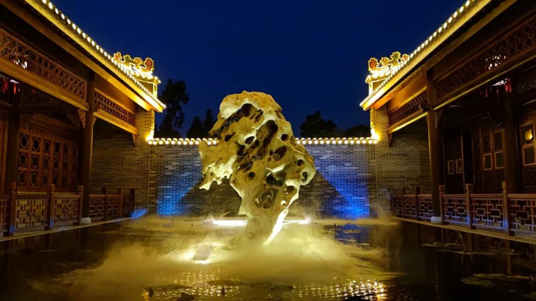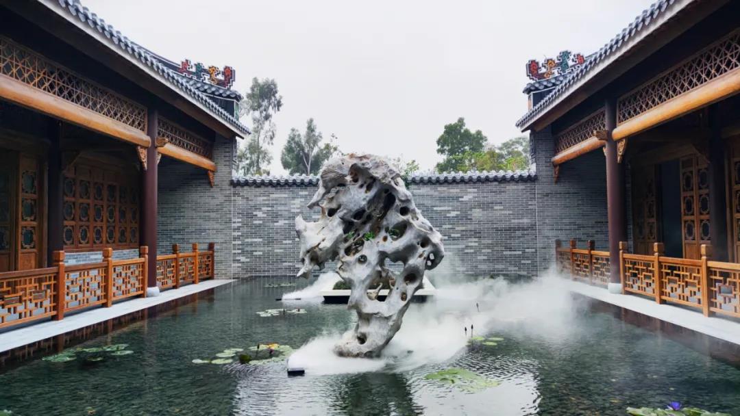 池中央矗立著一個造型獨特的“怪石”,陣陣煙霧隨風而散,含苞待放的荷花在“飄飄仙氣”的廊院內有一種朦朧的美感。