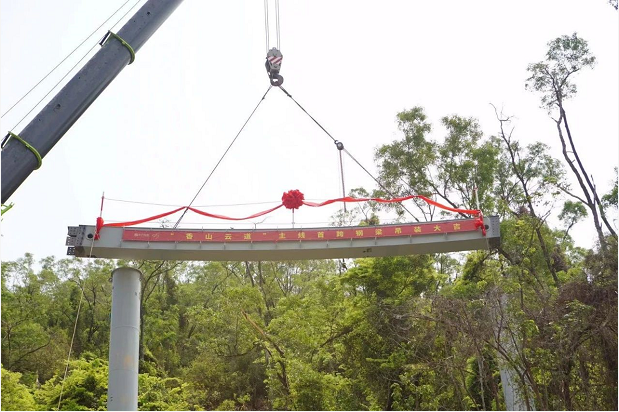 因香山云道作業(yè)處山林陡峭,整條云道共需安裝630座鋼梁。主線首跨鋼梁吊裝是按照先導(dǎo)試點的原則,實行首件工程制度——以首件工程樣板示范,引領(lǐng)后續(xù)各標(biāo)段同類工程的標(biāo)準(zhǔn)化施工。首跨鋼梁吊裝完成后,陸續(xù)吊裝在山林中的鋼梁將成為撐起香山云道的脊梁。