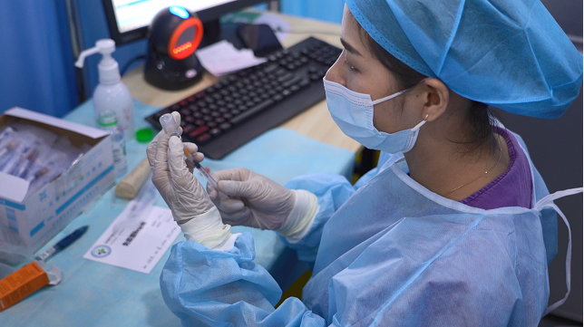 進入接種區(qū),醫(yī)護人員再次核對身份,為對象接種新冠疫苗。