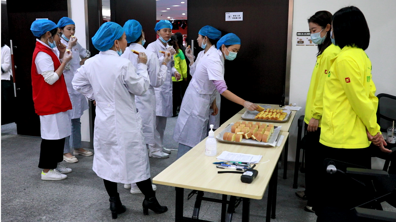 在接種現(xiàn)場,還有一群小黃人的身影,格外暖心。她們默默為疫苗注射做好各項統(tǒng)籌準(zhǔn)備,還貼心的為醫(yī)護工作者準(zhǔn)備小零食,在空閑的時候得以補充體力。