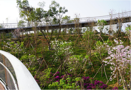 雞公山示范段采用中式園林設(shè)計(jì),山間水景,處處傾注匠心技藝,涓涓溪流順流而下,幽曲別致,信步棧道間。見(jiàn)水、聽(tīng)聲,卻不見(jiàn)石繞園林花樹,仿佛置身世外桃源。