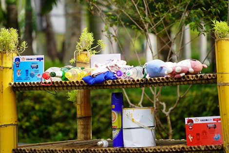 作品描述:該作品以輪胎、油桶、臺風枯枝、廢棄PVC水管、修剪剩下的竹子等破舊廢料為主要材料,通過刷漆加工彩繪,再用時花、植物點綴,營造出特色主題小景,不僅可以美化景觀,還起到了科普垃圾分類,引導市民提高環(huán)保意識的作用。