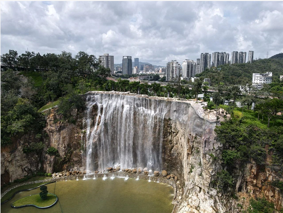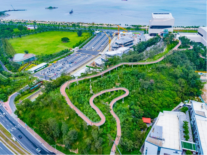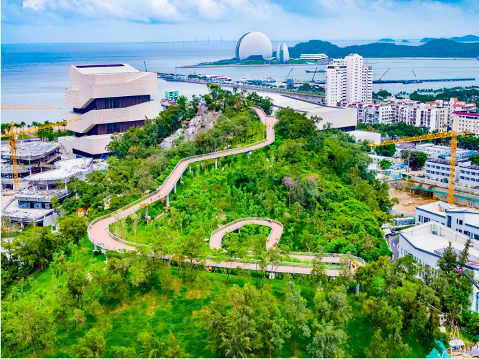 市民游客可從地面入口(珠海規(guī)劃展覽館北側(cè))徒步登上棧道,信步于山海之間,在呼吸“健康”的同時,將海天公園、日月貝、雞公山瀑布等城市美景盡收眼底,達到觀水觀城、通山達海、步移景異的景觀效果。