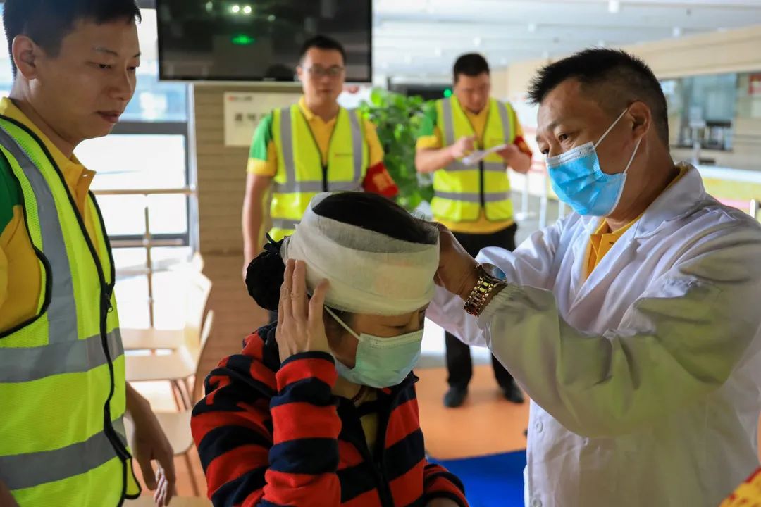 11時09分,演練準(zhǔn)時開始,演練現(xiàn)場由安全專員點(diǎn)燃煙霧彈觸發(fā)煙感報警器報警。監(jiān)控中心接到報警信號后立即安排巡邏崗到報警地點(diǎn)查看,確認(rèn)后向監(jiān)控中心匯報,隨后進(jìn)行受傷人員緊急救治演練。