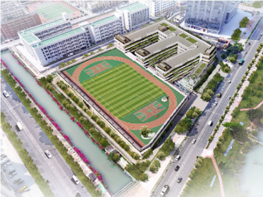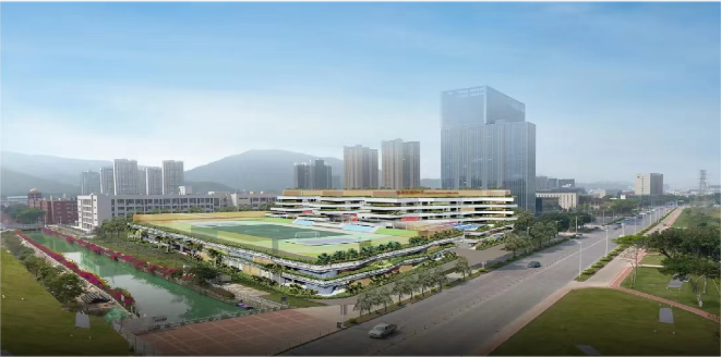 項目按一流標(biāo)準(zhǔn)配建教學(xué)樓、綜合實驗樓、文體綜合樓、地下人防設(shè)施,以及與周邊環(huán)境融合協(xié)調(diào)的校園綠化景觀等,整體設(shè)計既體現(xiàn)現(xiàn)代化與智能化,又富有建筑美、空間美、人文美和藝術(shù)美。最引人注目的,是建在文體綜合樓頂?shù)沫h(huán)形田徑運動場,這是香洲區(qū)學(xué)校配建的第一個“空中運動場”,通過“向天空要面積”,讓整個學(xué)?!白兇蟆?、“變寬”,為師生提供足夠的運動空間,也為校園增添別樣的美感。