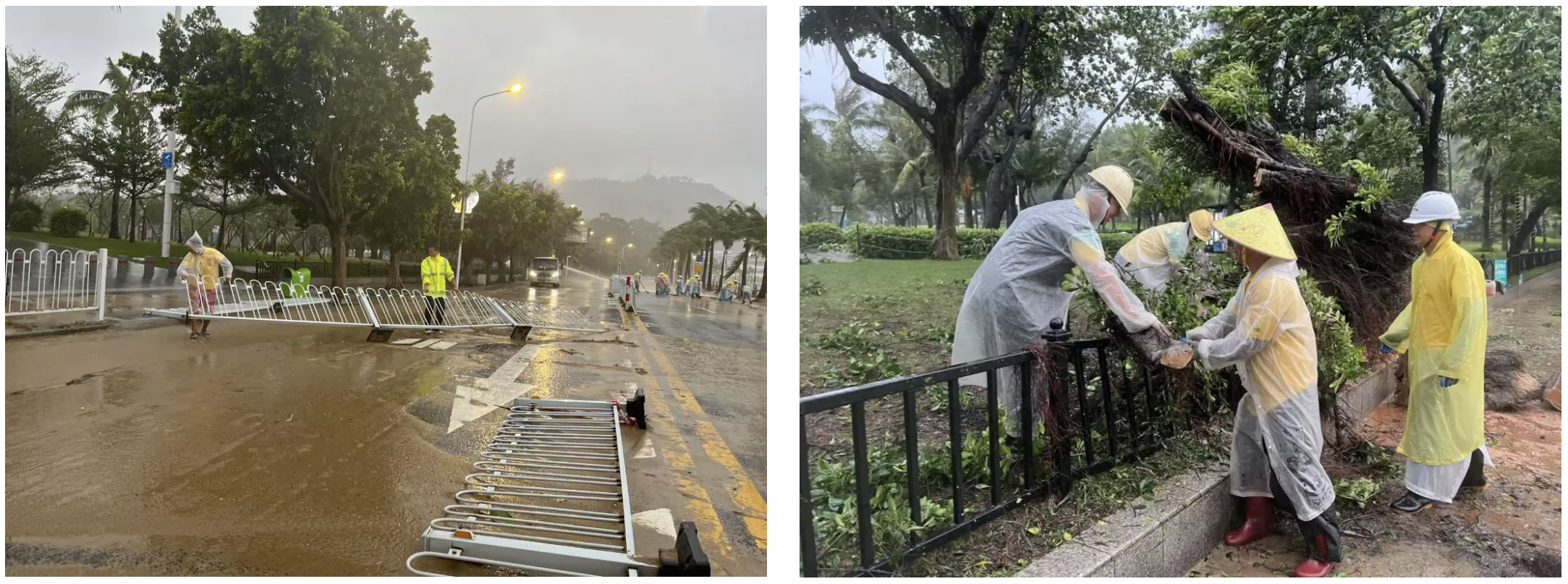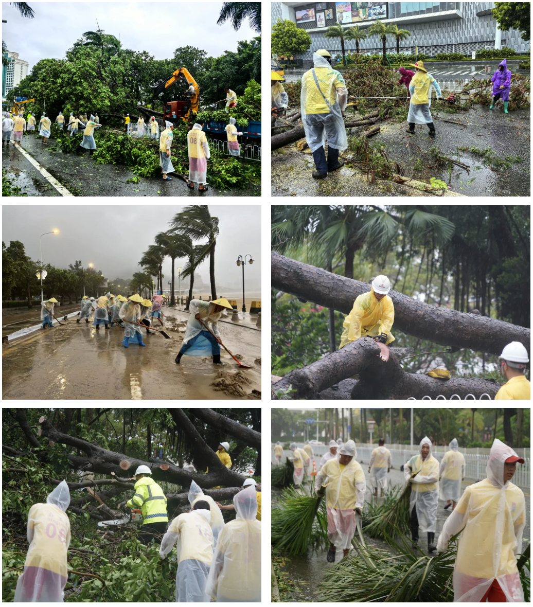 受臺風(fēng)及雨勢影響,公司管養(yǎng)區(qū)域內(nèi)1600余棵樹木倒伏,出現(xiàn)斷枝散落、阻塞道路、積水淤堵等情況。搶險隊伍第一時間奔赴各區(qū)域及受災(zāi)點,爭分奪秒開展清障保通、排險除患工作。重點清理倒伏樹木、斷枝落葉、破損圍擋、廣告牌等路面障礙。同時疏通被泥沙、雜物堵塞的下水口,加速路面積水排放。經(jīng)過數(shù)小時奮戰(zhàn),“清障先鋒”們組織力量高效打通道路,情侶路等主干道已恢復(fù)通行條件。