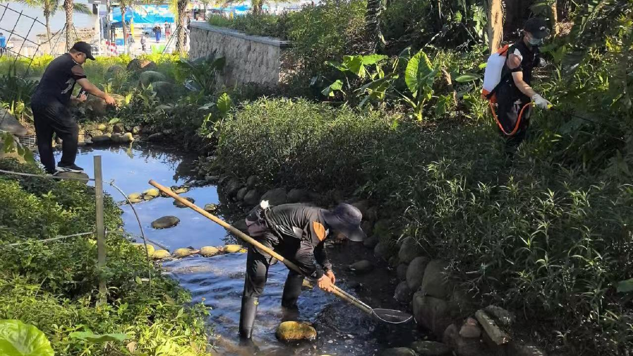 全面開展蚊蟲消殺與積水清理工作,加強(qiáng)戶外廣場(chǎng)、休息區(qū)等人員活動(dòng)區(qū)域的成蚊消殺力度,細(xì)致排查清理景觀花盆底座、空調(diào)外機(jī)位、排水口等易積水部位,確保公共環(huán)境干燥整潔。