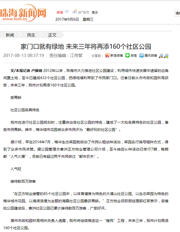 珠海新聞網(wǎng):家門口就有綠地 未來三年將再添160個(gè)社區(qū)公園 2017-08-13 珠海新聞網(wǎng):家門口就有綠地 未來三年將再添160個(gè)社區(qū)公園 返回列表 上一篇:珠海網(wǎng):眾志成城 救災(zāi)復(fù)產(chǎn) 居民、企業(yè)齊上陣 志愿參加道路清障 下一篇:珠江晚報(bào):把綠地福利帶到市民家門口未來三年珠海再添160個(gè)社區(qū)公園