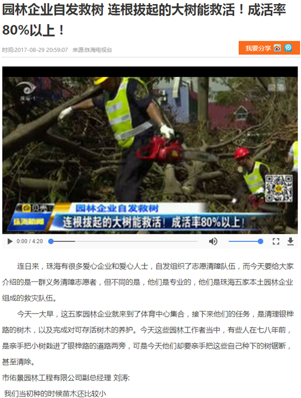 珠海網(wǎng):園林企業(yè)自發(fā)救樹(shù) 連根拔起的大樹(shù)能救活!成活率80%以上! 2017-08-29 珠海網(wǎng):園林企業(yè)自發(fā)救樹(shù) 連根拔起的大樹(shù)能救活!成活率80%以上! 返回列表 上一篇:微博-珠海香洲:前山街道及社區(qū)工作人員在香山湖公園轉(zhuǎn)移工棚人員 下一篇:珠海網(wǎng):黨員走在前 全民齊參與 近3000人參與情侶路清障保潔 某海防旅支援我市救災(zāi)