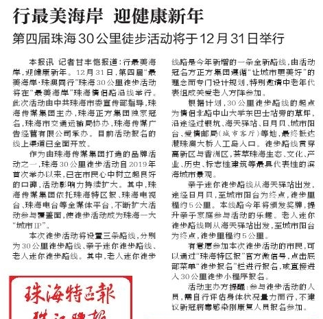 本報訊 記者甘豐愷報道:行最美海岸,迎健康新年。12月31日,第四屆“最美海岸·珠澳同行”珠海30公里徒步活動將在“最美海岸”珠海情侶路沿線舉行。此次活動由中共珠海市委宣傳部指導(dǎo),珠海傳媒集團主辦,珠海正方集團獨家冠名,珠海市交通運輸局協(xié)辦,珠海傳媒廣告經(jīng)營有限公司承辦。目前活動報名的線上渠道已全面開放。