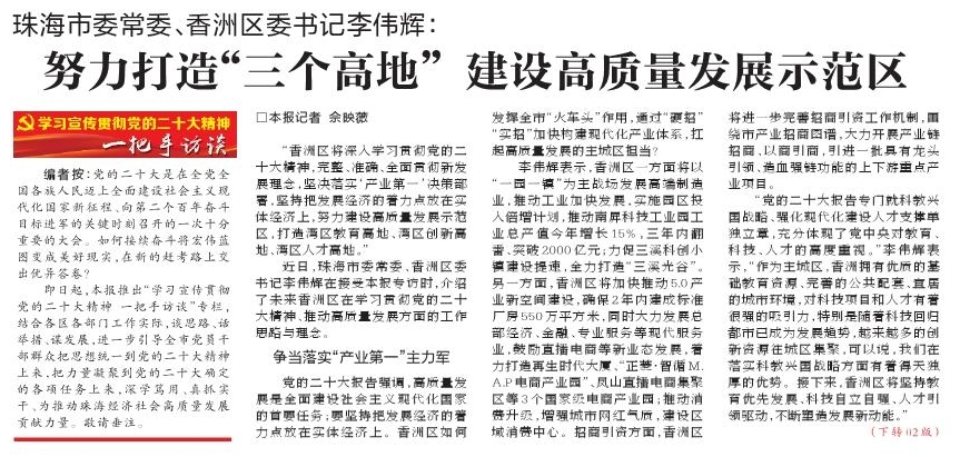 “香洲區(qū)將深入學(xué)習(xí)貫徹黨的二十大精神,完整、準(zhǔn)確、全面貫徹新發(fā)展理念,堅決落實‘產(chǎn)業(yè)第一’決策部署,堅持把發(fā)展經(jīng)濟的著力點放在實體經(jīng)濟上,努力建設(shè)高質(zhì)量發(fā)展示范區(qū),打造灣區(qū)教育高地、灣區(qū)創(chuàng)新高地、灣區(qū)人才高地?!?