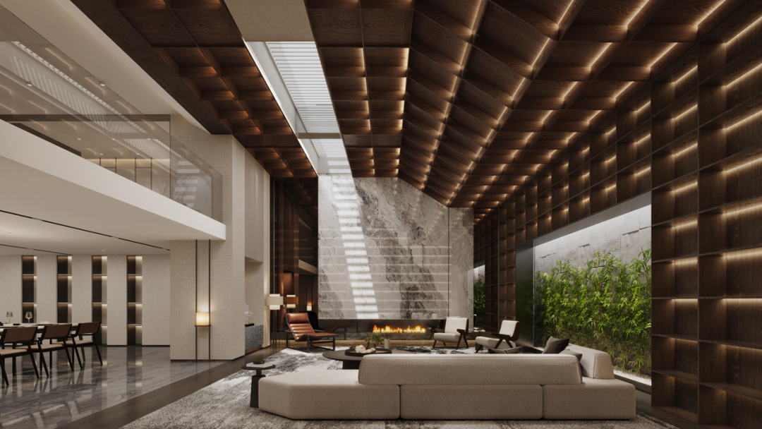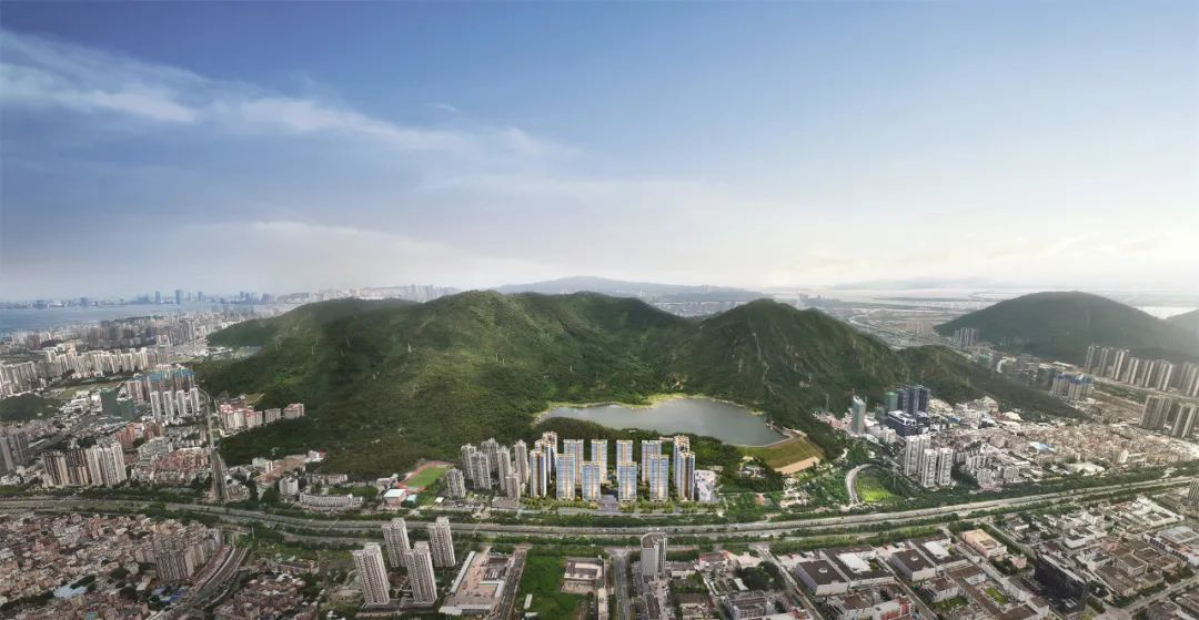 在大師團隊的妙筆下,整個項目規(guī)劃建設(shè)7棟塔樓、8棟板樓、15棟疊墅,高層圍繞南面的黑白面將軍山和南屏水庫形成為圍合之勢,將面寬1000m的湖景和5000m的山景資源最大化,實現(xiàn)建筑與外部環(huán)境的融合協(xié)調(diào)。
