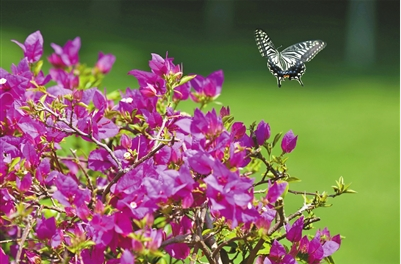 恰好是珠海短暫而美好的秋景,在一城、一園中完整而盛大地展現(xiàn)。沐浴在秋日的陽光里,高矮灌木錯落有致,五彩花卉爭奇斗艷,久居家中的市民在園中小徑悠閑漫步,健身器材上老者踢腿扭腰。這一片生機之中,成群結(jié)隊翩翩飛舞的蝴蝶,最為吸引目光。